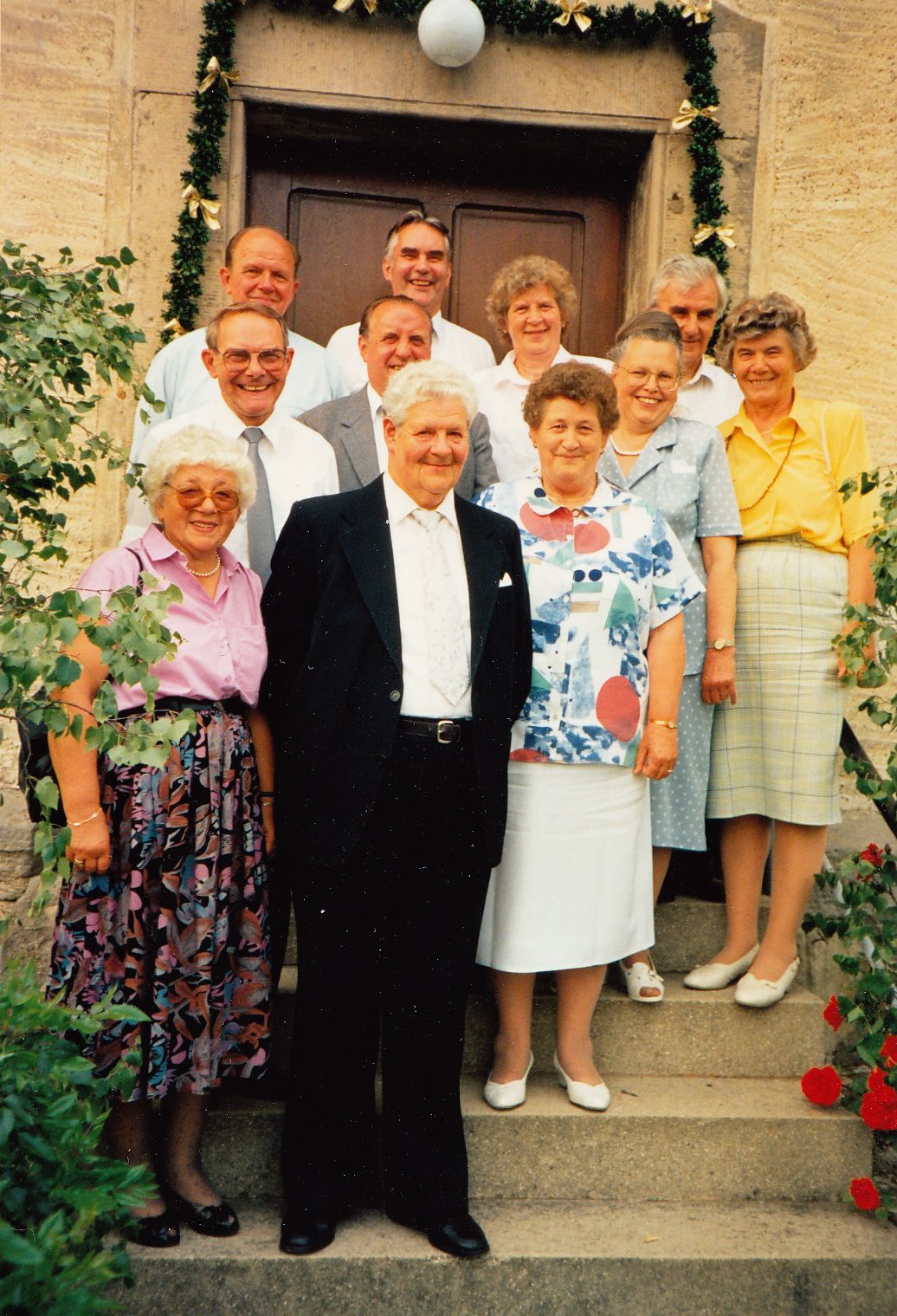 von links: Ehepaar Hilbert Prühl, Ernst Müller, Willi Schatz, Friedel Schatz, Ehepaar Otto Schneegans, Antonia Fuge (vh. Heiroth), Inge Schatz (vh. Hindemith), ..., Lisa Eberhardt )vh. Ackermann),
