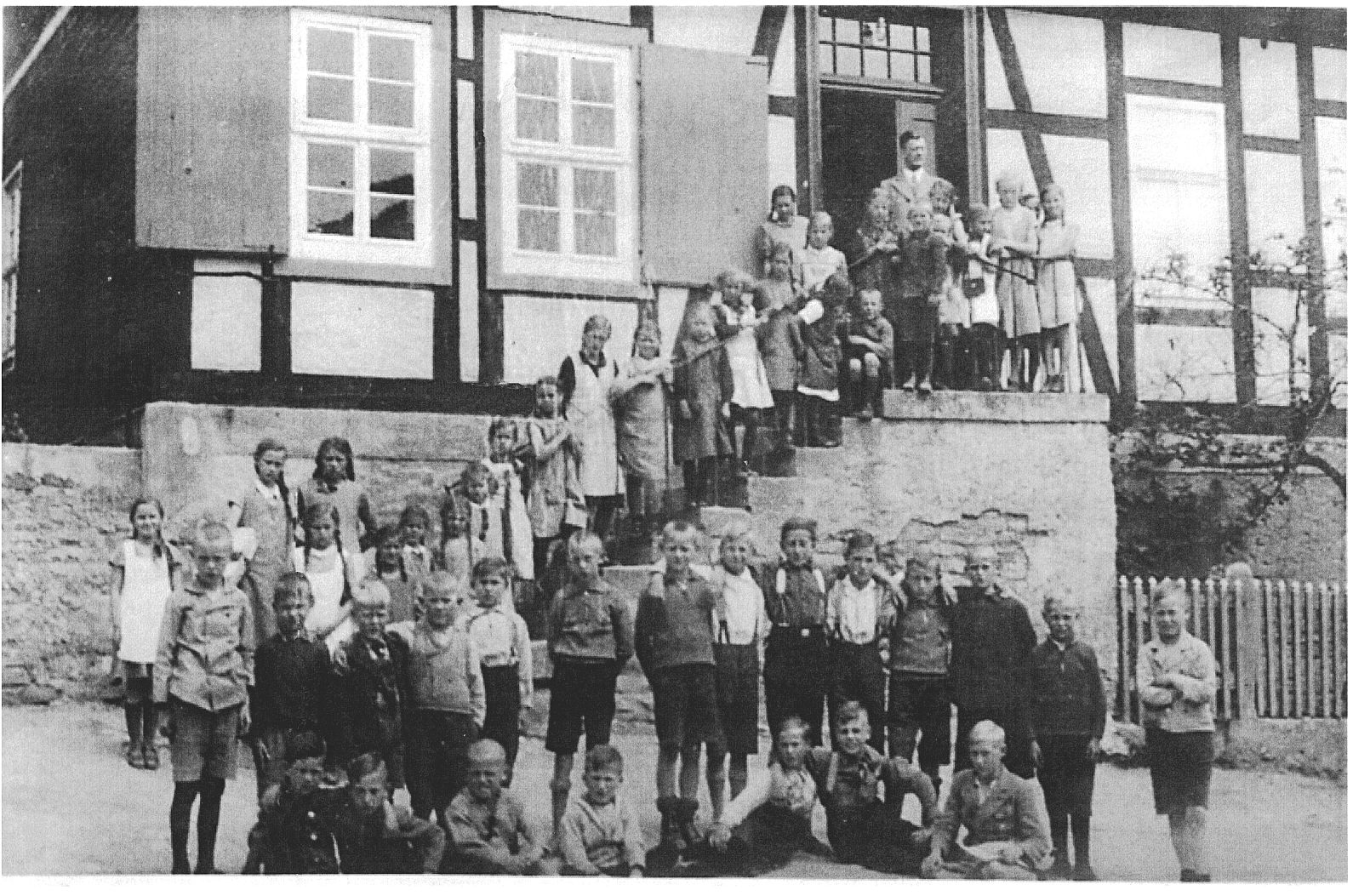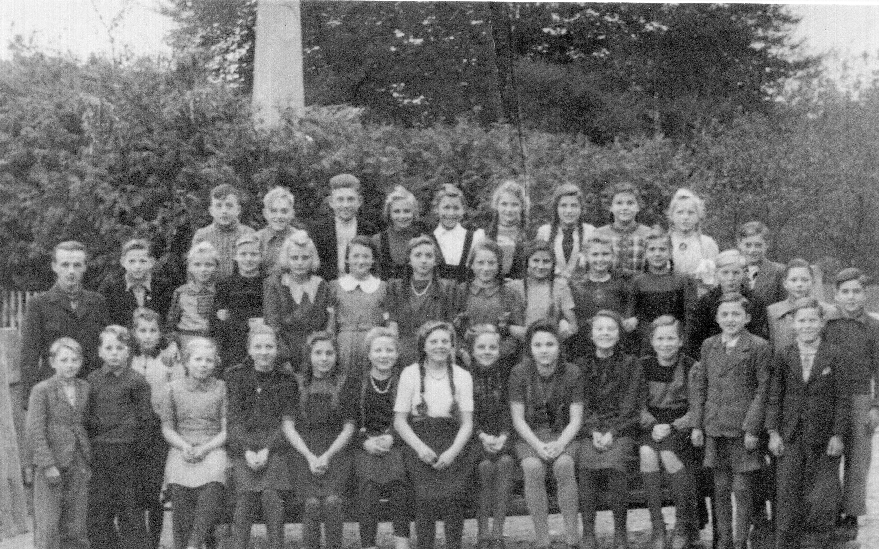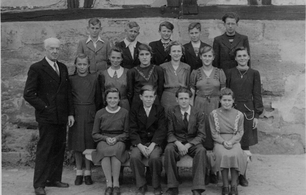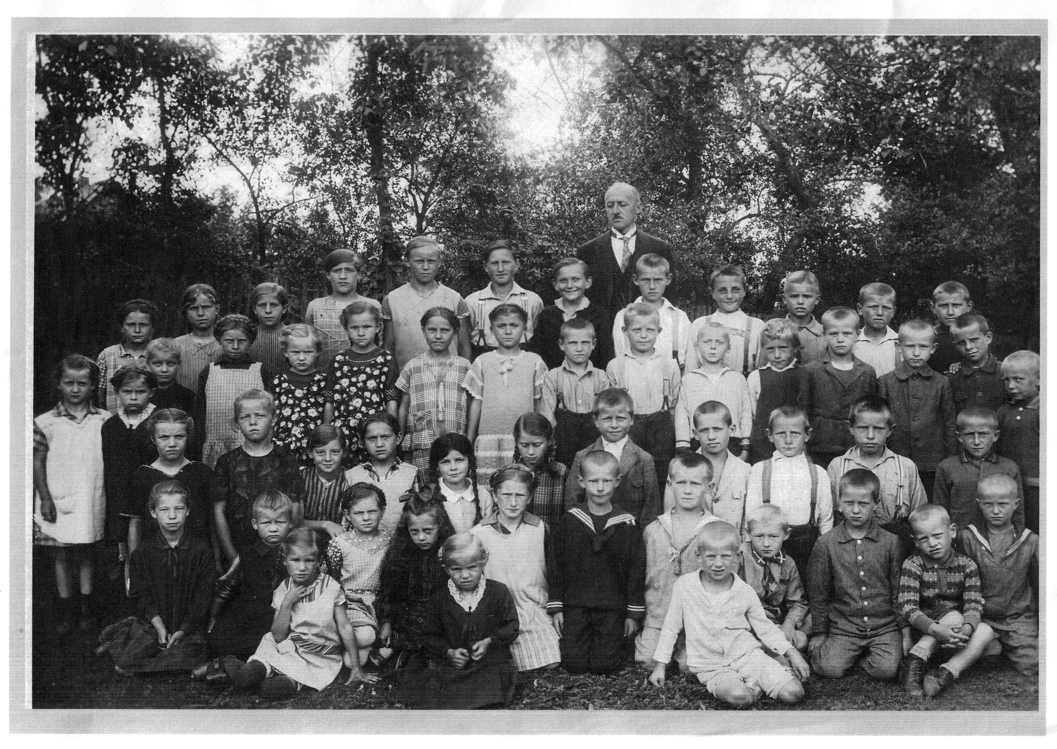 Luine Schweineberg, Marie Bauer ('36), Else Otto, Charlotte Brehmke ('36), Erna Ertmer, Lisa Eberhardt, Gertrud Bauer, Henni Schatz, Berta Prühl, Agnes Schneegans, Alma Gunkel ('36), Lucie Fuge, Gisela Weydemann, Ilse Klaus, Helga Ertmer, Johanna Klaus ('36), Irmgard Otto, Toni Fuge (mit dem Rücken), Willi Bauer, Ilse Eberhardt, Kurt Hentrich, Lehrer Schäufler, Annie Brehmke, Ilse Schneegans, Irene Hesse, Hilde Bauer, Else Klaus ('36), Thekla Fuge ('36)
