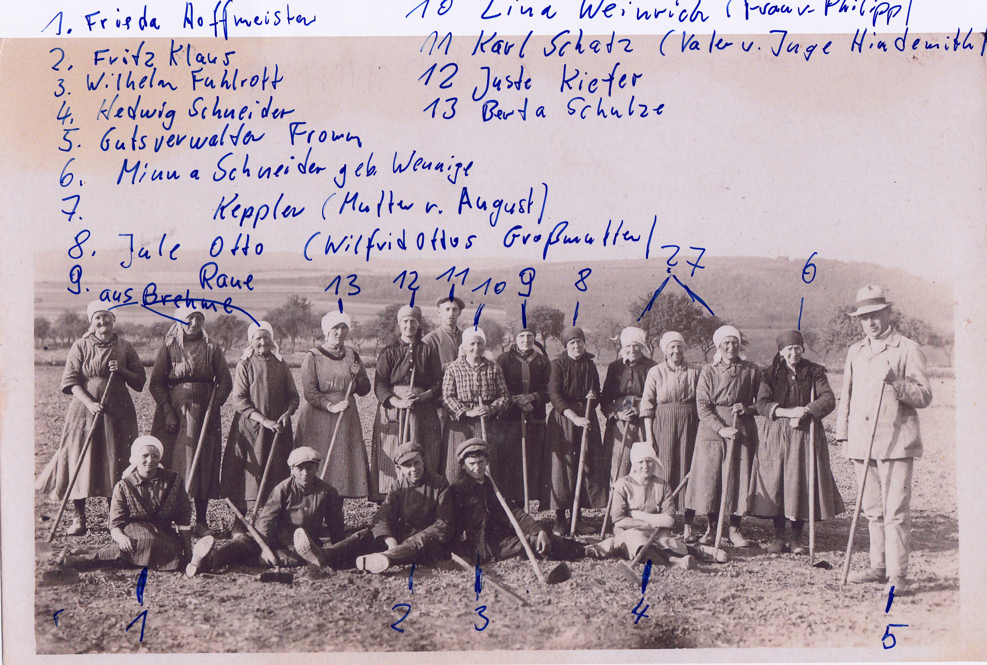 Marie Gunkel, Helene Prühl, Anna + Frieda Alter, Else Schweineberg, Karl Juch, Ernst Kranert, Lehrer Beyer, Willi Ertmer, Friedrich Bauer, Ernst Hentrich, Friedrich Schulze, Ernst Otto